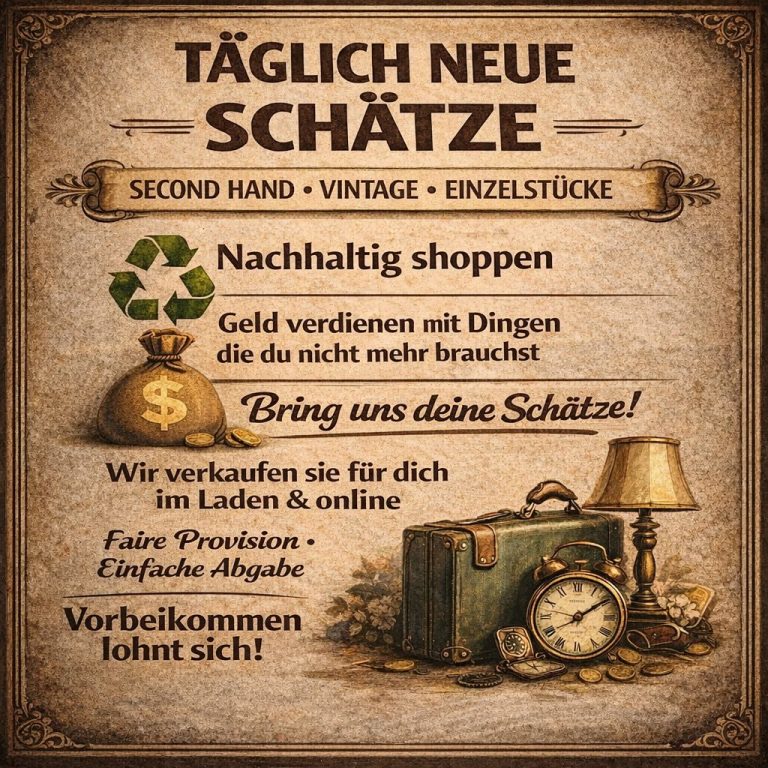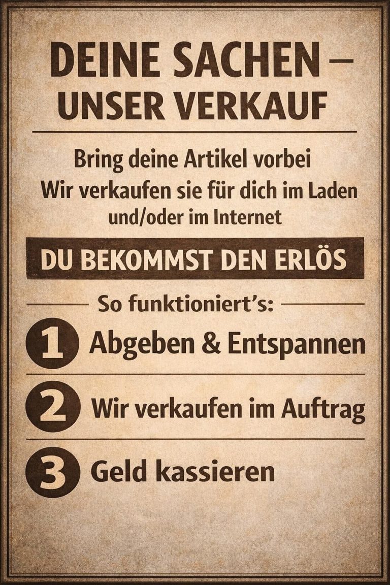 Du bringst uns deine gut erhaltenen Artikel vorbei – wir kümmern uns um den Rest. Von der Präsentation im Laden bis zur Einstellung in unseren Onlineshop oder auf Verkaufsplattformen.